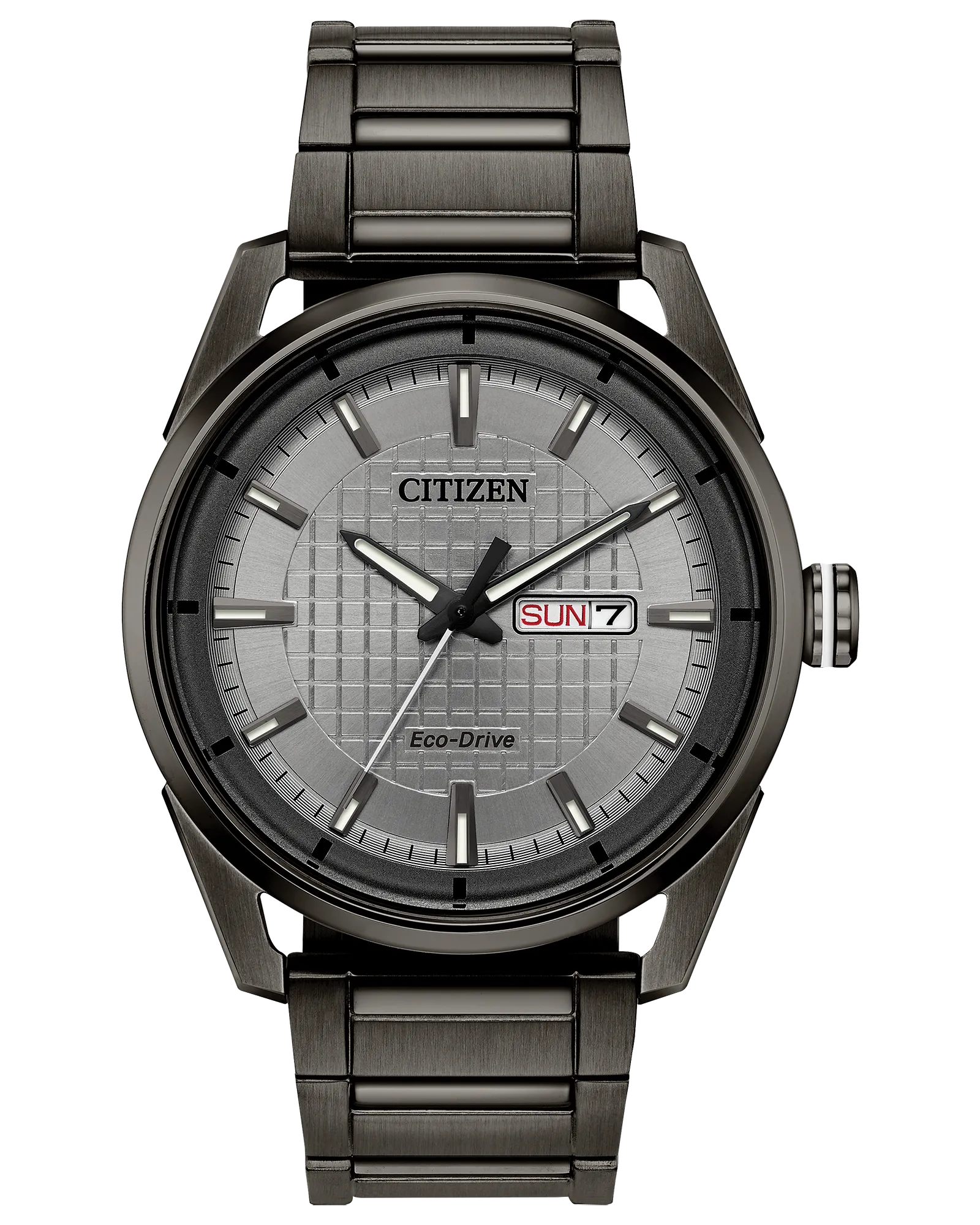 La CTO de la collection DRIVE de CITIZEN®. Une collection de montres au design classique et moderne. Présentée ici en acier inoxydable plaqué ion gris, avec cadran gris et affichage jour/date. Dotée de notre technologie Eco-Drive, elle est alimentée par la lumière, quelle que soit la lumière. Jamais a besoin d'une batterie.