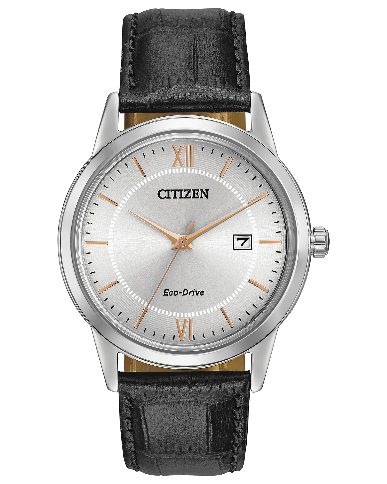 Un design classique, un bracelet en cuir noir et un affichage de la date caractérisent cette montre habillée traditionnelle de la collection Corso de CITIZEN®. Présentée avec un boîtier en acier inoxydable et un cadran argenté métallisé rehaussé de touches or rose.