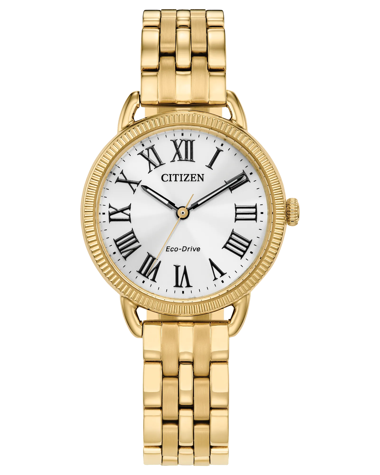 Une version moderne d'un design classique. Dotée d'un élégant boîtier doré avec une lunette texturée à bords arrondis et d'un cadran argenté à trois aiguilles orné de chiffres romains audacieux, cette montre élégante se distingue tout en restant discrète. Un boîtier en acier inoxydable doréCette montre est dotée d'une boucle déployante en acier pour un look minimaliste. Alimentée par la lumière grâce à la technologie Eco-Drive, cette montre fonctionne sans pile et offre un look raffiné et une sensation haut de gamme.
