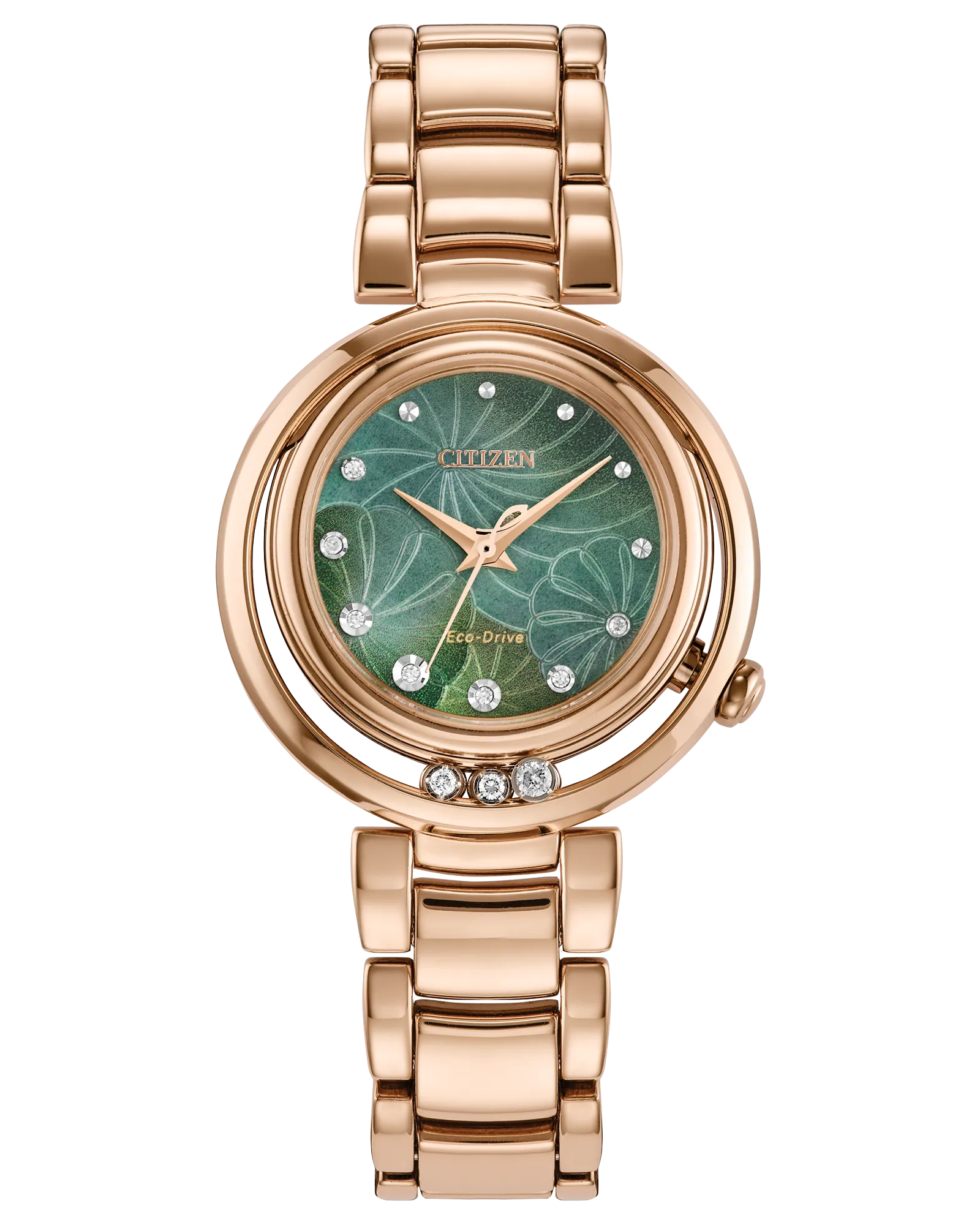 Des lignes classiques et une touche de romantisme font de la Citizen L Arcly, la toute dernière pièce de notre collection femme, un ajout captivant au luxe durable. Inspirée du modèle original Citizen « Sunrise », cette montre distinctive en acier inoxydable doré rose estUn accessoire charmant au poignet, idéal pour une allure glamour. Ses lignes épurées définissent la silhouette de 29,8 mm de la montre, tandis qu'une couronne discrète à 4 heures et un diamant à 7 heures ajoutent à son charme délicat. Sur son cadran en nacre aux reflets verts, des index diamants appliqués et des aiguilles fines indiquent l'heure avec style, sur un subtil motif floral, mettant ainsi en valeur l'esthétique pure du garde-temps. Alimentée par la lumière grâce à notre technologie Eco-Drive exclusive, cette élégante montre pour femme est le complément parfait pour sublimer toutes vos tenues. Calibre E031.