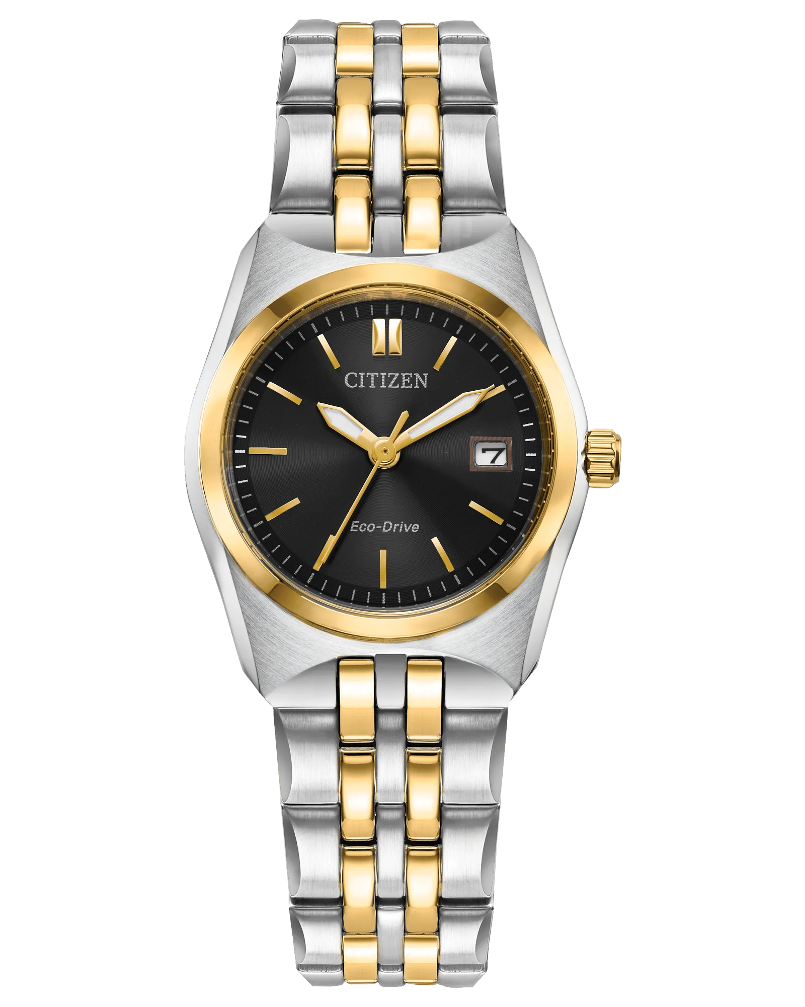La montre Corso pour femme de Citizen est un modèle classique et intemporel. Elle est dotée d'un bracelet et d'un boîtier bicolores en acier inoxydable doré et argenté, d'un cadran noir à trois aiguilles avec date, d'aiguilles lumineuses et d'index dorés.Cette montre élégante est dotée d'un fermoir à boucle déployante avec boutons-poussoirs dissimulés et est étanche jusqu'à 100 mètres. Si vous recherchez une montre habillée pour sublimer votre style sans effort, la Corso est le choix idéal. Elle utilise également la technologie Eco-Drive exclusive de Citizen, ce qui lui permet de se recharger grâce à la lumière et de ne jamais nécessiter de pile. Calibre E011.