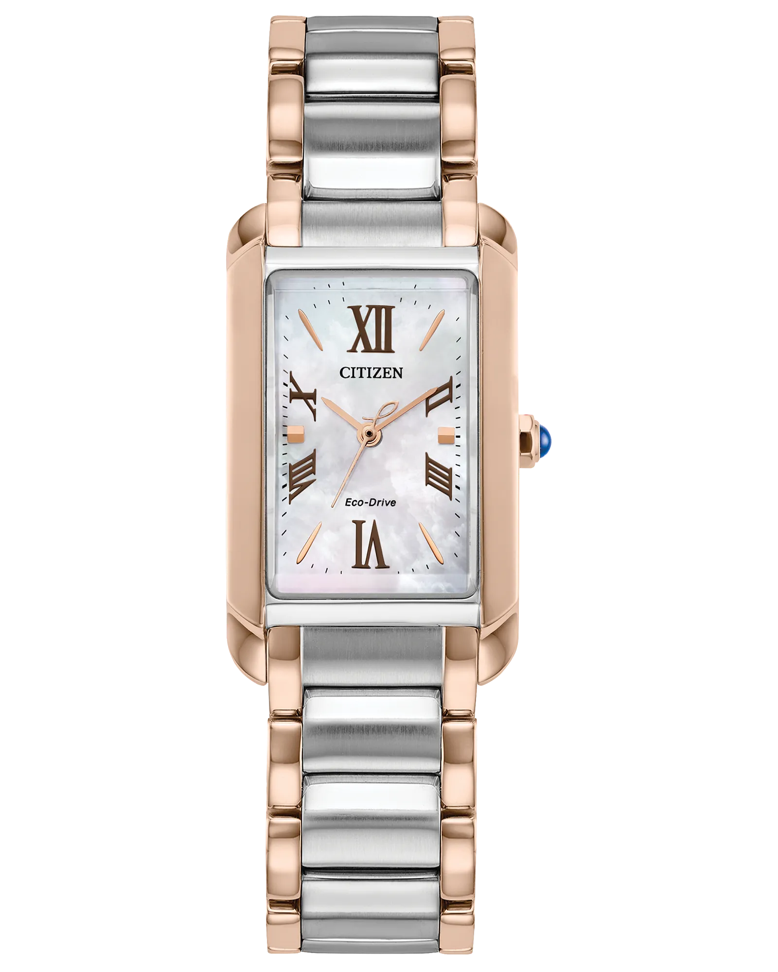 Lignes classiques et sophistication discrète font de la Citizen L Bianca, dernière-née de notre collection femme, un ajout charmant à notre gamme de luxe durable. Son design, inspiré de l'Art déco et célébrant ses motifs féminins, se distingue par ses teintes argentées et roses.Cette montre en acier inoxydable doré présente un boîtier allongé et une couronne ornée d'un saphir synthétique discret, lui conférant un charme irrésistible. Son boîtier rectangulaire incurvé de 32,4 mm est complété par un bracelet à trois maillons.