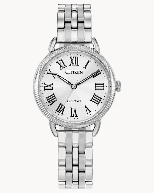Une version moderne d'un design classique. Dotée d'un élégant boîtier argenté avec une lunette texturée à bords arrondis et d'un cadran argenté à trois aiguilles orné de chiffres romains audacieux, cette montre élégante se distingue tout en restant discrète. Un boîtier en acier inoxydable argentéCette montre est dotée d'une boucle déployante en acier pour un look minimaliste. Alimentée par la lumière grâce à la technologie Eco-Drive, cette montre fonctionne sans pile et offre un look raffiné et une sensation haut de gamme.