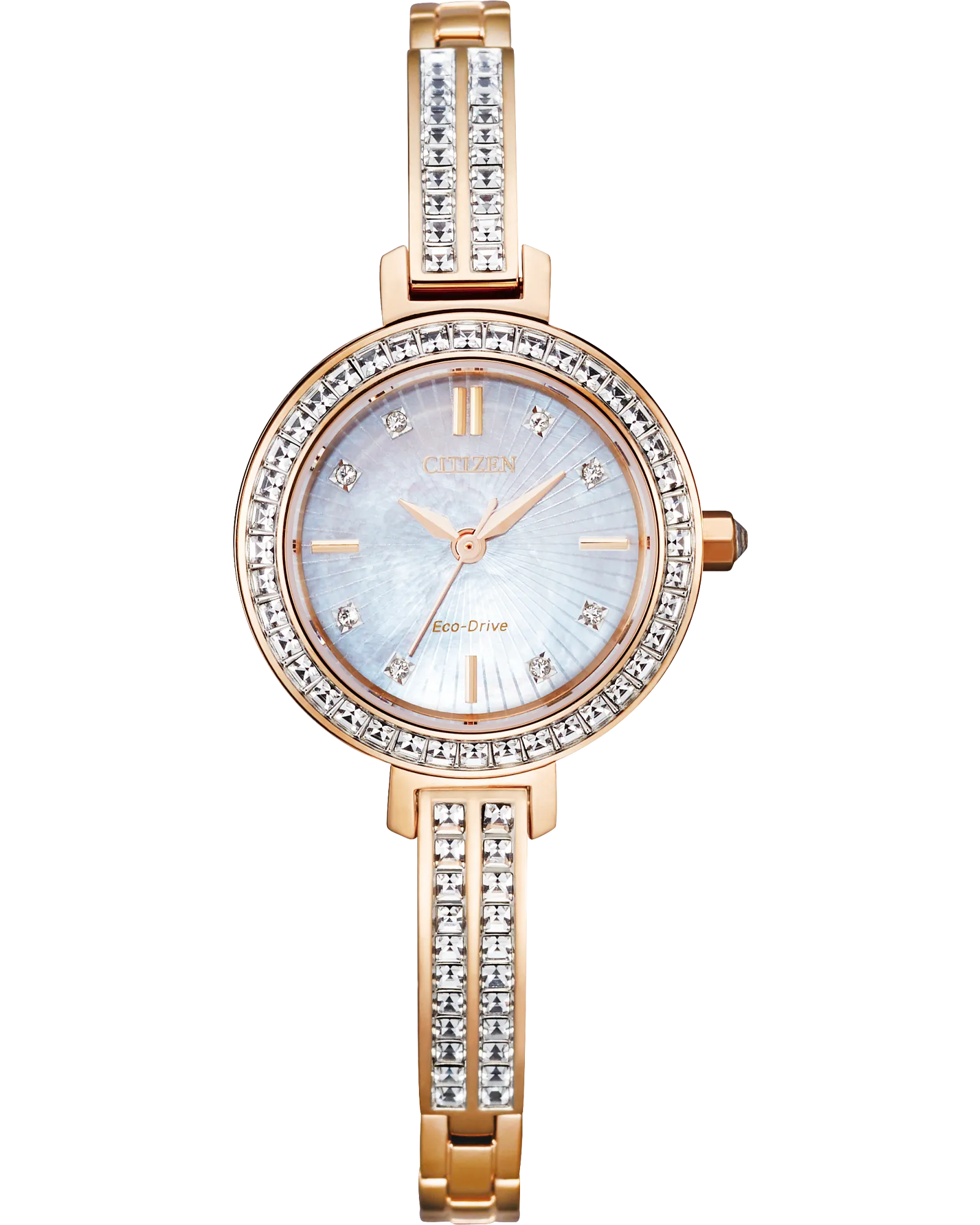 L'élégante Silhouette Crystal de CITIZEN® est une montre conçue pour la femme moderne. Son boîtier et son bracelet en acier inoxydable couleur or rose sont ornés de cristaux. Le cadran en nacre est également rehaussé d'élégants cristaux. Son design jonc lui permetÀ porter seul ou avec plusieurs bracelets pour créer des looks uniques en toute occasion. Éclairé par la technologie Eco-Drive, il est toujours prêt pour une soirée en ville.