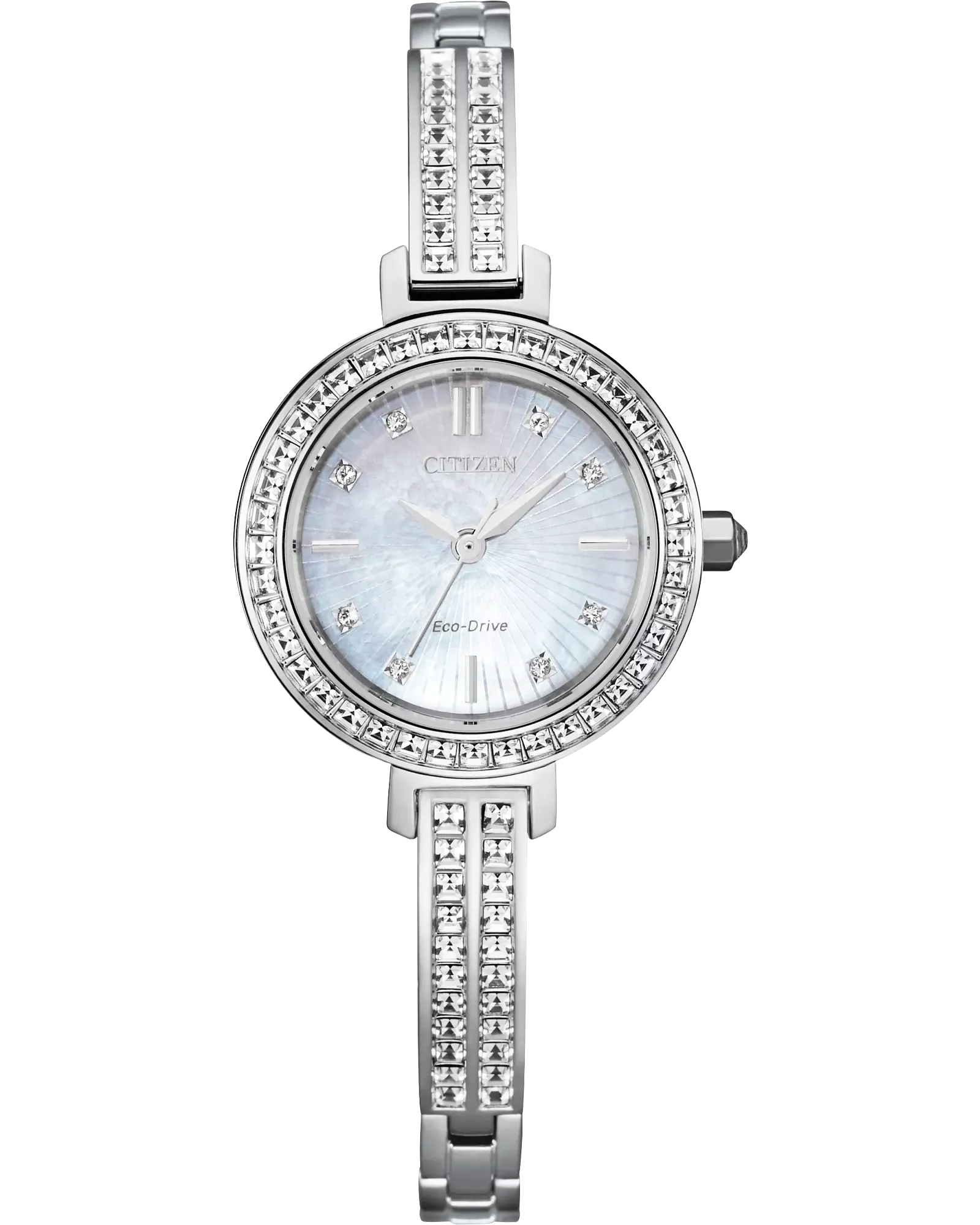 L'élégante Silhouette Crystal de CITIZEN® est une montre conçue pour la femme moderne. Son boîtier et son bracelet en acier inoxydable sont ornés de cristaux. Le cadran en nacre est également rehaussé d'élégants cristaux. Son design jonc permet de la porter seule.Ou associez-le à plusieurs bracelets pour créer des looks uniques en toute occasion. Éclairé par la technologie Eco-Drive, il est toujours prêt pour une soirée en ville.